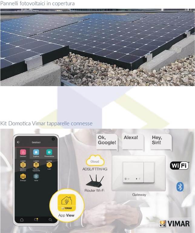 Inoltre, impianto domotica di base per comandare le tapparelle motorizzate, predisposizione antifurto con telecamere, VMC installata in ogni vano con specifico impianto sul serramento, portone sezionale box coibentato e motorizzato, videocitofono, etc.