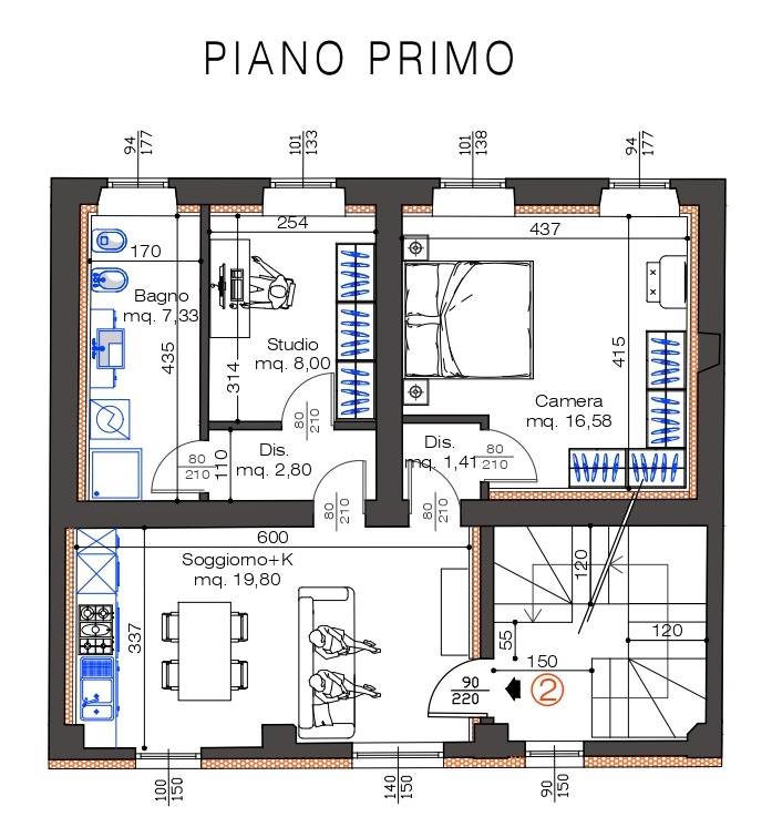 Piano primo soggiorno con cucina a vista, disimpegno, 2 camere, bagno finestrato.
