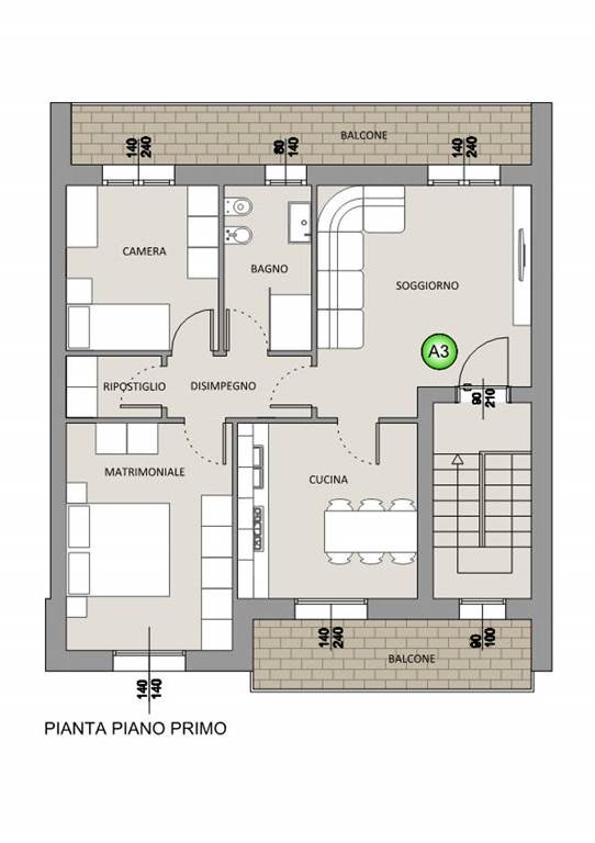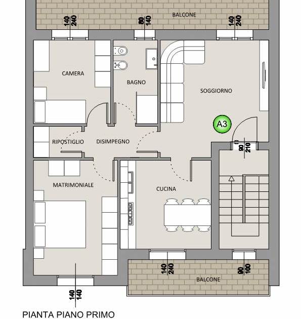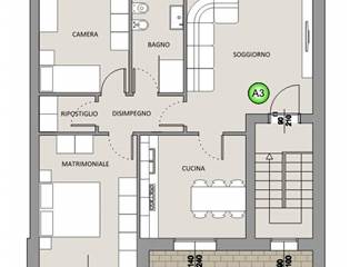 Ingresso pedonale indipendente da scala esclusiva coperta e chiusa, zona giorno da circa 32mq calpestabili con soggiorno e cucina abitabile anche separabile, disimpegno, camera matrimoniale, seconda camera, bagno, ulteriore vano ad uso ripostiglio o secondo bagno/lavanderia.