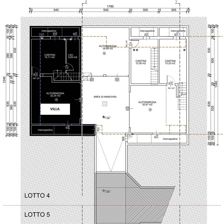Piano interrato: cantina da 23mq, box da 35mq, intercapedini da 17mq.