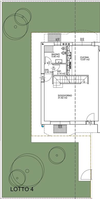 Piano terra: soggiorno con cucina separata per un totale di ben 46mq calpestabili, disimpegno bagno e ripostiglio.