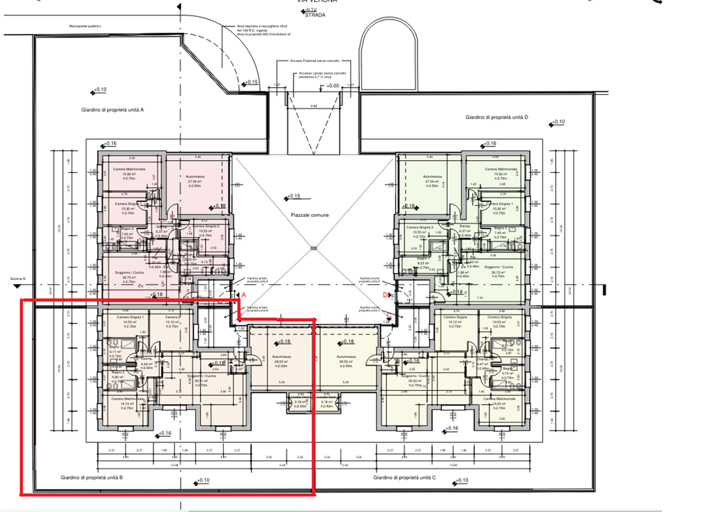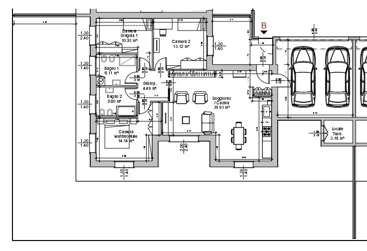 Villa B: giardino esclusivo di circa 200mq a giro sui tre lati della casa, ingresso con guardaroba, soggiorno open space da ben 40mq calpestabili con zona cucina e pranzo a vista ma fra loro ben separati, disimpegno con accesso diretto al box doppio in larghezza, 2 bagni finestrati, camera matrimoniale, seconda camera da 13mq e terza camera da quasi 11mq.