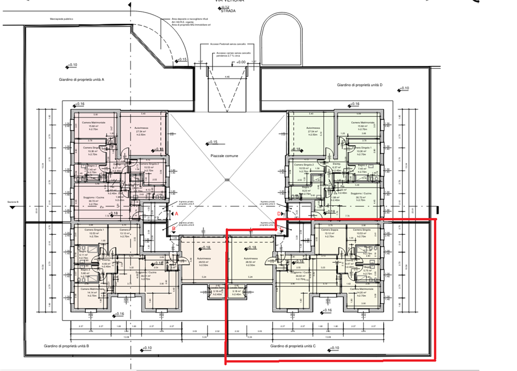 Villa C: giardino esclusivo di circa 200mq a giro sui tre lati della casa, ingresso con guardaroba, soggiorno open space da ben 40mq calpestabili con zona cucina e pranzo a vista ma fra loro ben separati, disimpegno con accesso diretto al box doppio in larghezza, 2 bagni finestrati, camera matrimoniale, seconda camera da 13mq e terza camera da quasi 11mq.