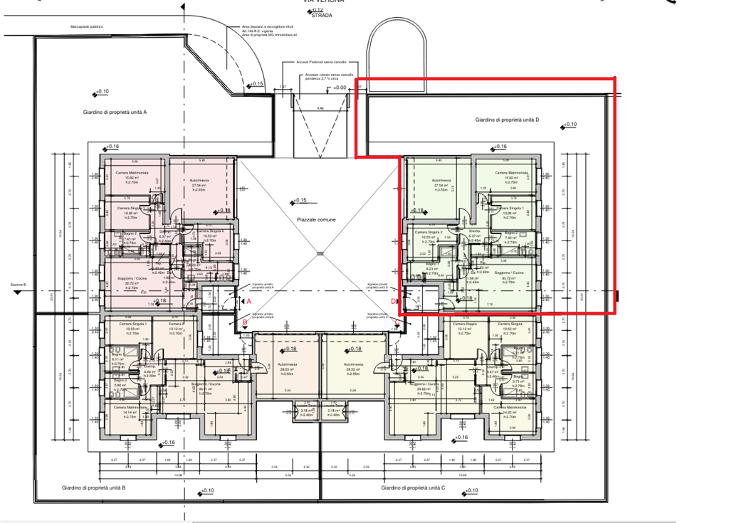 Si dispongono su UNICO LIVELLO A PIANO TERRA da circa 120mq ciascuno oltre ai box doppi in larghezza da circa 33mq.Giardini privati da 250 a 200mq.