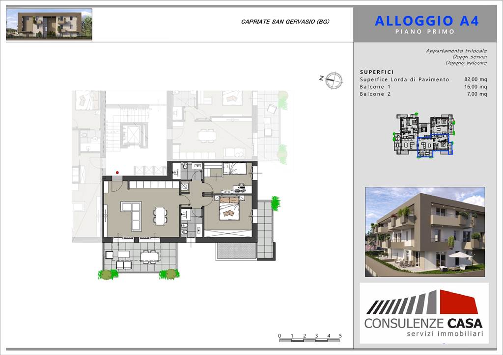 Appartamento 4 piano primo: 82mq con tipologia trilocale, ampio e luminoso soggiorno con cucina a vista, 2 bagni, 2 camere da letto, terrazzo vivibile da 16mq e balcone da 7mq, box doppio circa 37mq già nel prezzo ma da potersi scegliere fra quelli a disposizione.