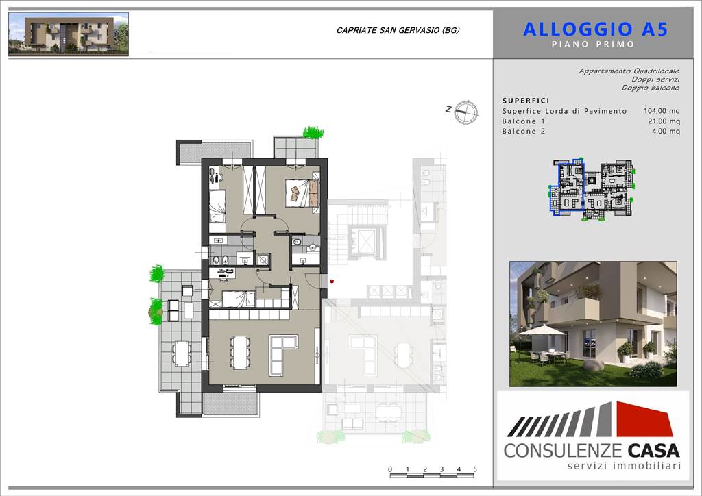 Appartamento 5 piano primo: 104mq con tipologia quadrilocale, grande e luminoso soggiorno con cucina a vista, 2 bagni, 3 camere da letto, terrazzo vivibile da ben 21mq e balcone da 4mq, box doppio circa 37mq già nel prezzo ma da potersi scegliere fra quelli a disposizione.