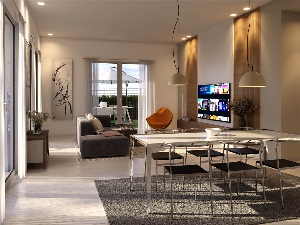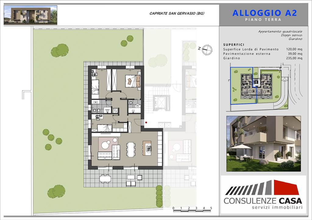 Appartamento 2 piano terra: 120mq con tipologia quadrilocale, grande e luminoso soggiorno con cucina a vista, 2 bagni, 3 camere da letto, grande area esterna di proprietà esclusiva di circa 274mq, box doppio circa 37mq già nel prezzo ma da potersi scegliere fra quelli a disposizione.
