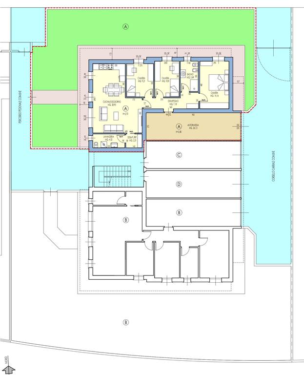 Appartamento A: 100mq abitativi oltre box doppio da 30mq e giardino esclusivo da 176mq, tipologia quadrilocale con 3 camera da letto, ampio soggiorno con cucina a vista, 2 bagni, prezzo 320.000€ già comprensivo di allacciamenti ed accatastamenti (141mq comm. tot. parz.).