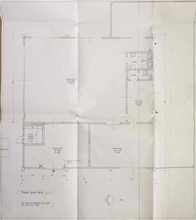 Trattasi di 375mq commerciali (349 capannone/calpestabili 308) di cui ufficio 20mq, 2 magazzini 96mq, laboratorio 173mq, locale caldaia 6mq, bagni 13mq. Area esterna circa 250mq + 1500mq di terreno agricolo antistante adibibile anche a parcheggio.