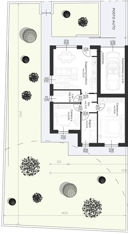 Le ville hanno tipologia abitativa con 2 camere da letto, ampia e luminosa zona giorno con cucina a vista, disimpegno, 2 bagni finestrati (padronale e di servizio/lavanderia), box singolo e posto auto.