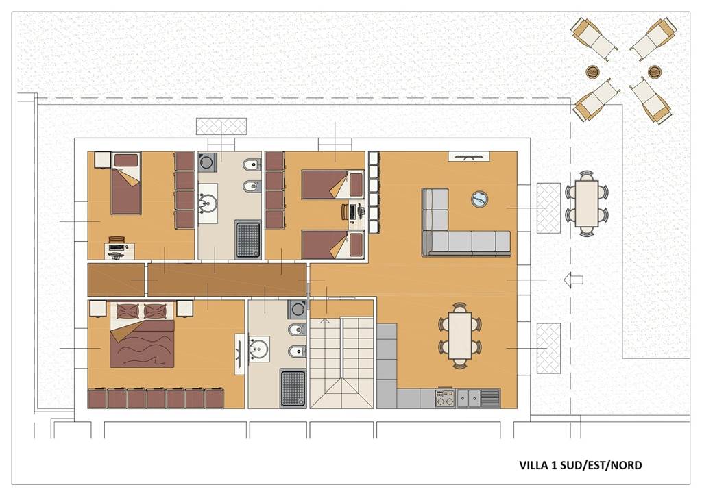Villa n° 1 esposta sud/est/nord: prezzo 475.000€. Questa villa ha anche area di proprietà di circa 40mq di fronte all'ingresso del suo box oltre a giardino da 220mq.